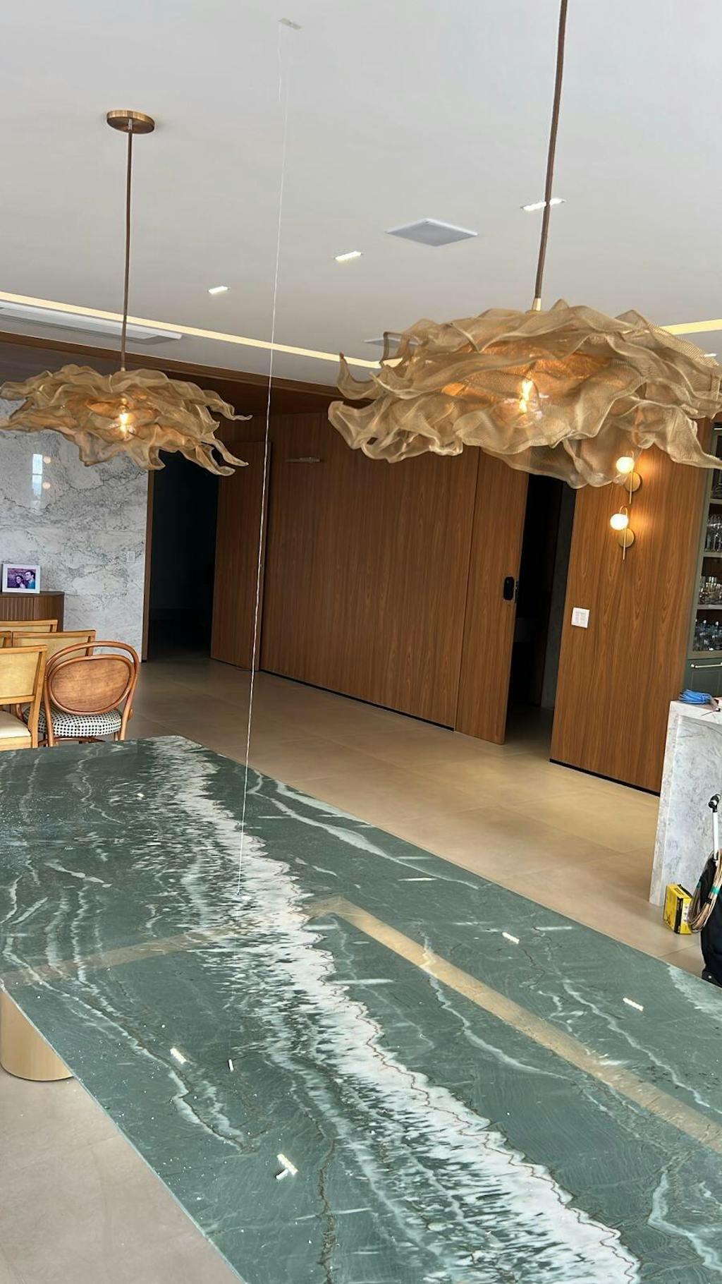 Eleve o nível da sua decoração com a Luminária Pendente LP027 Flow, uma peça exclusiva que une design fluido e contemporâneo com acabamento dourado premium. Inspirada em linhas orgânicas e movimento, essa luminária pendente cria um efeito visual hipnotizante, como se as malhas de aço dançassem com a luz, transformando qualquer ambiente em um espaço de puro luxo e elegância.