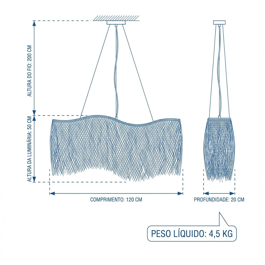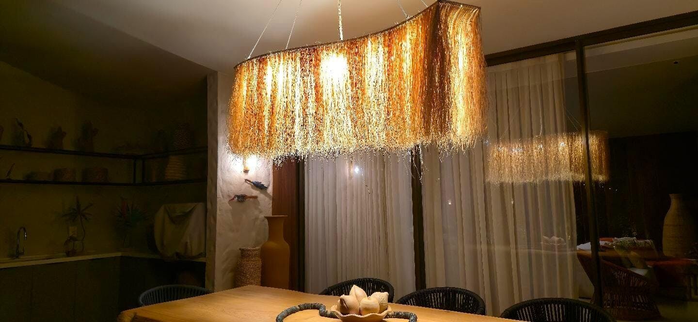 Com seu design orgânico e fluido, a luminária forma um volume generoso e leve ao mesmo tempo. A trama dos fios de buriti cria um jogo poético de luz e sombra quando a lâmpada é acesa, trazendo uma atmosfera acolhedora, natural e com textura rica.